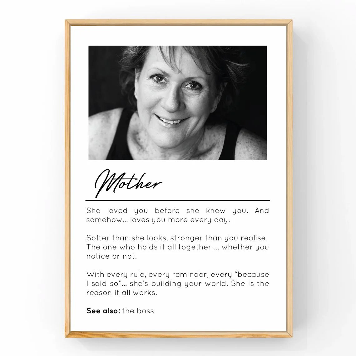 She loved you before she knew you. And somehow… loves you more every day. Softer than she looks, stronger than you realise. The one who holds it all together ... whether you notice or not. With every rule, every reminder, every “because I said so”… she’s building your world. She is the reason it all works. See also: the boss